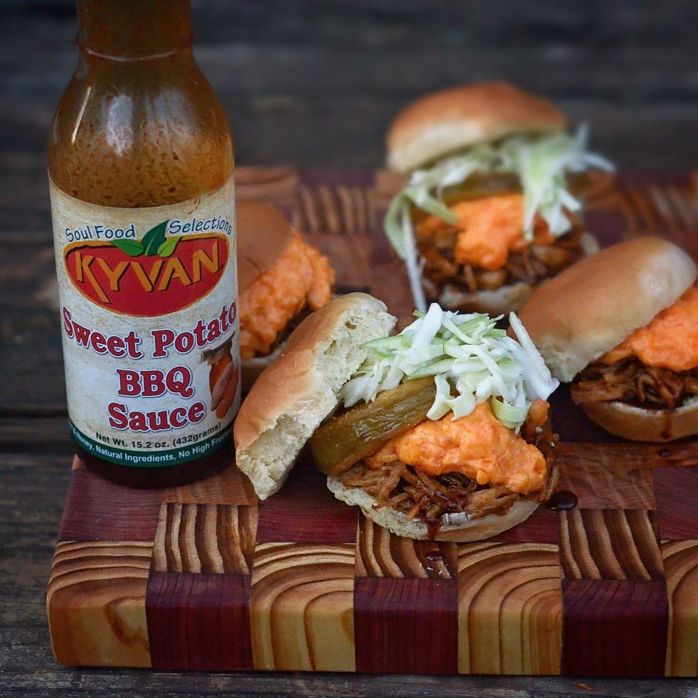 Sweet Potato BBQ Sauce: Your eyes are not deceiving you! The FIRST ever Sweet Potato BBQ Sauce is now available compliments of KYVAN Foods!!! We've taken the goodness of sweet potatoes and combined it with ripe tomatoes and golden honey to create a blend of flavors unique to the market and sure to send your tastebuds into overdrive! The wholesome goodness of sweet potatoes never tasted so good!